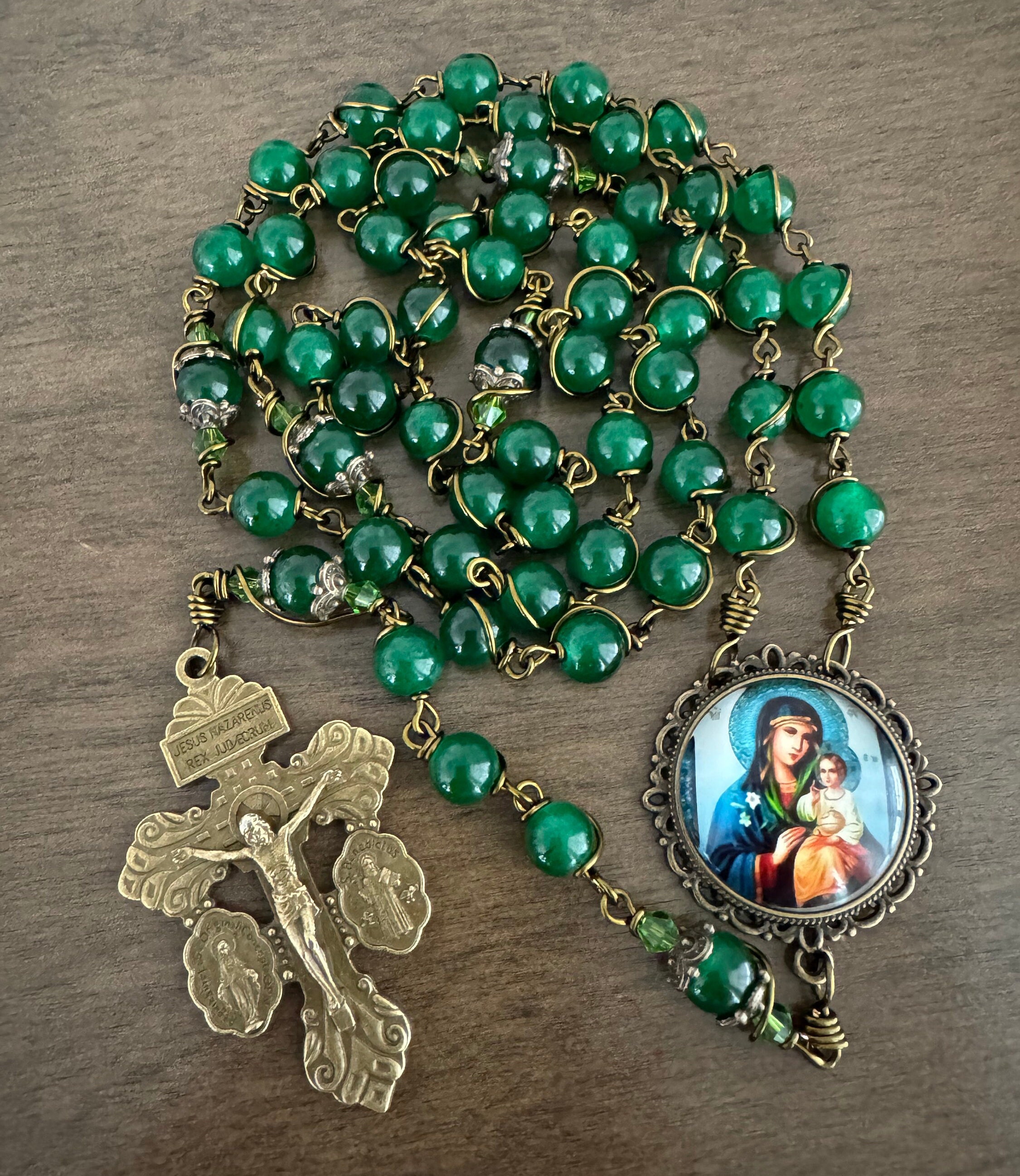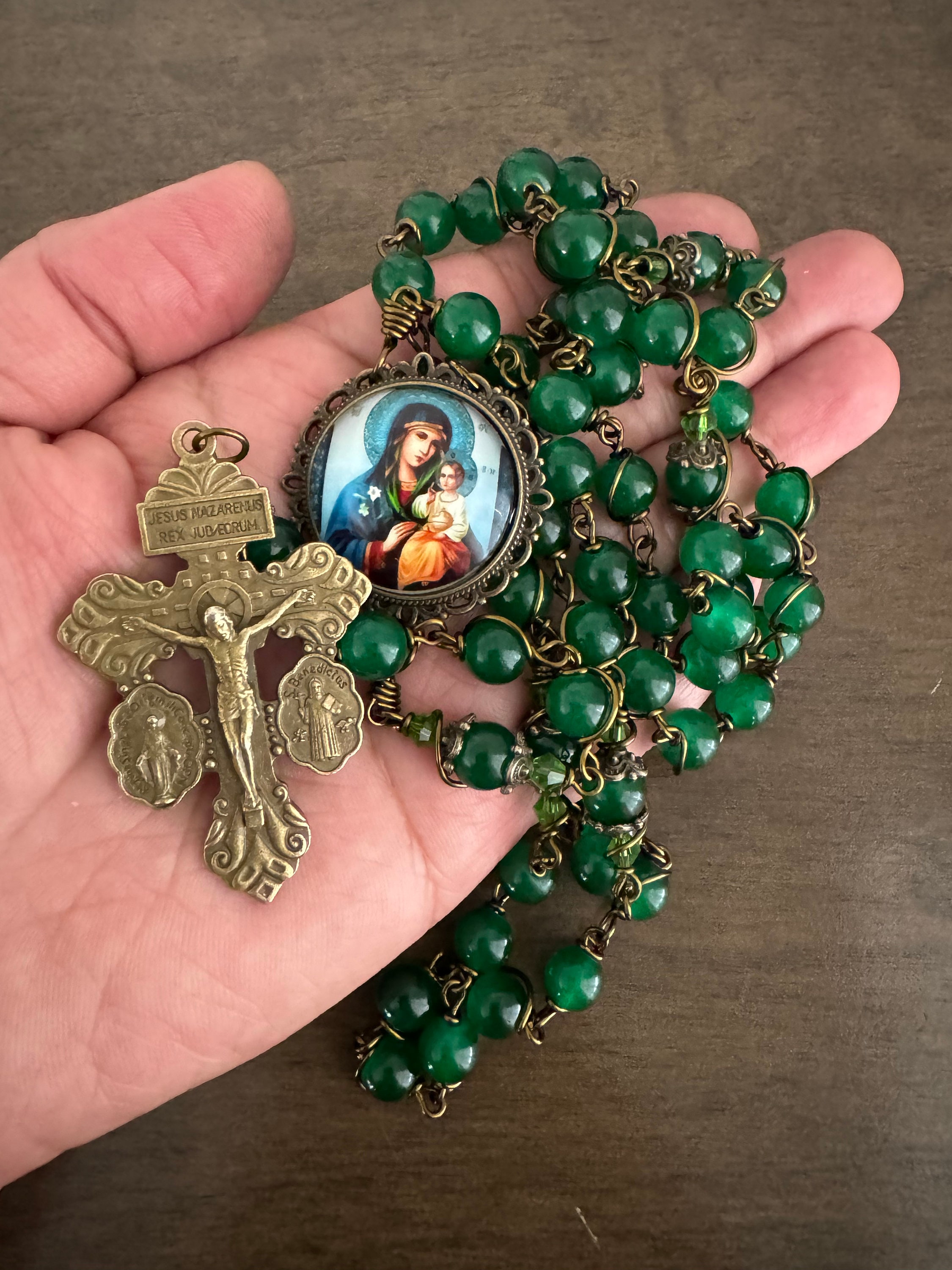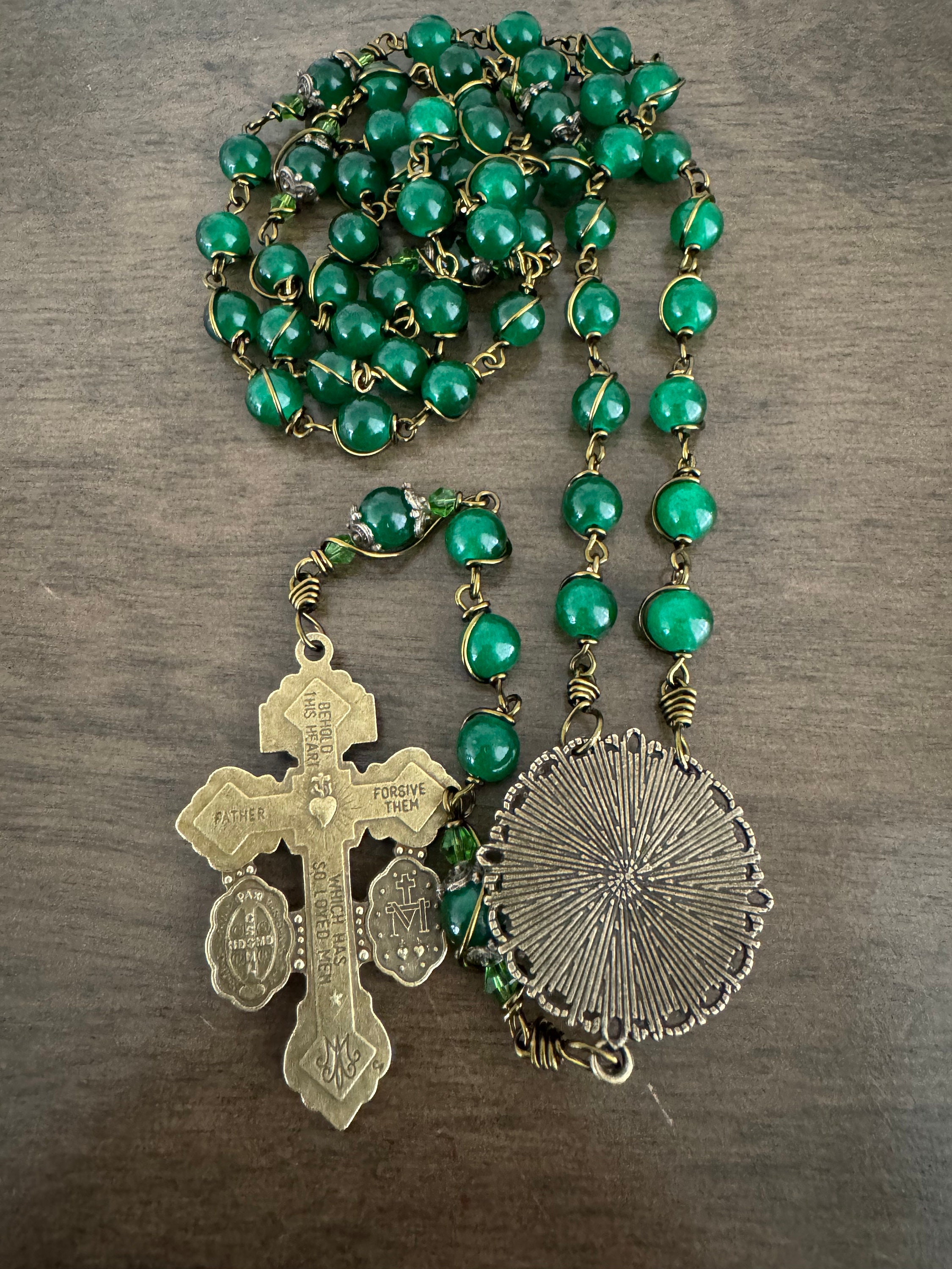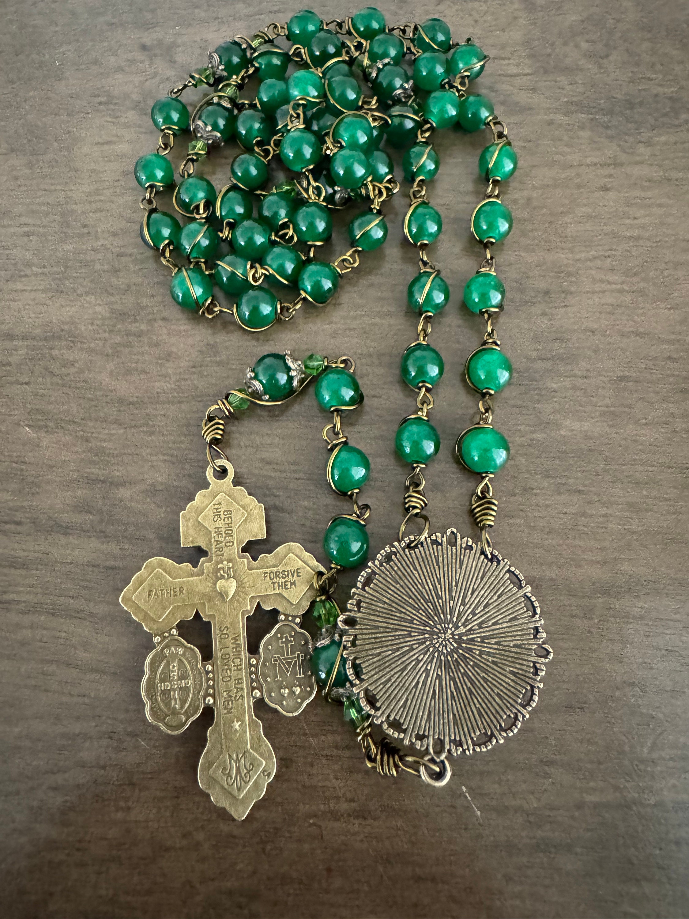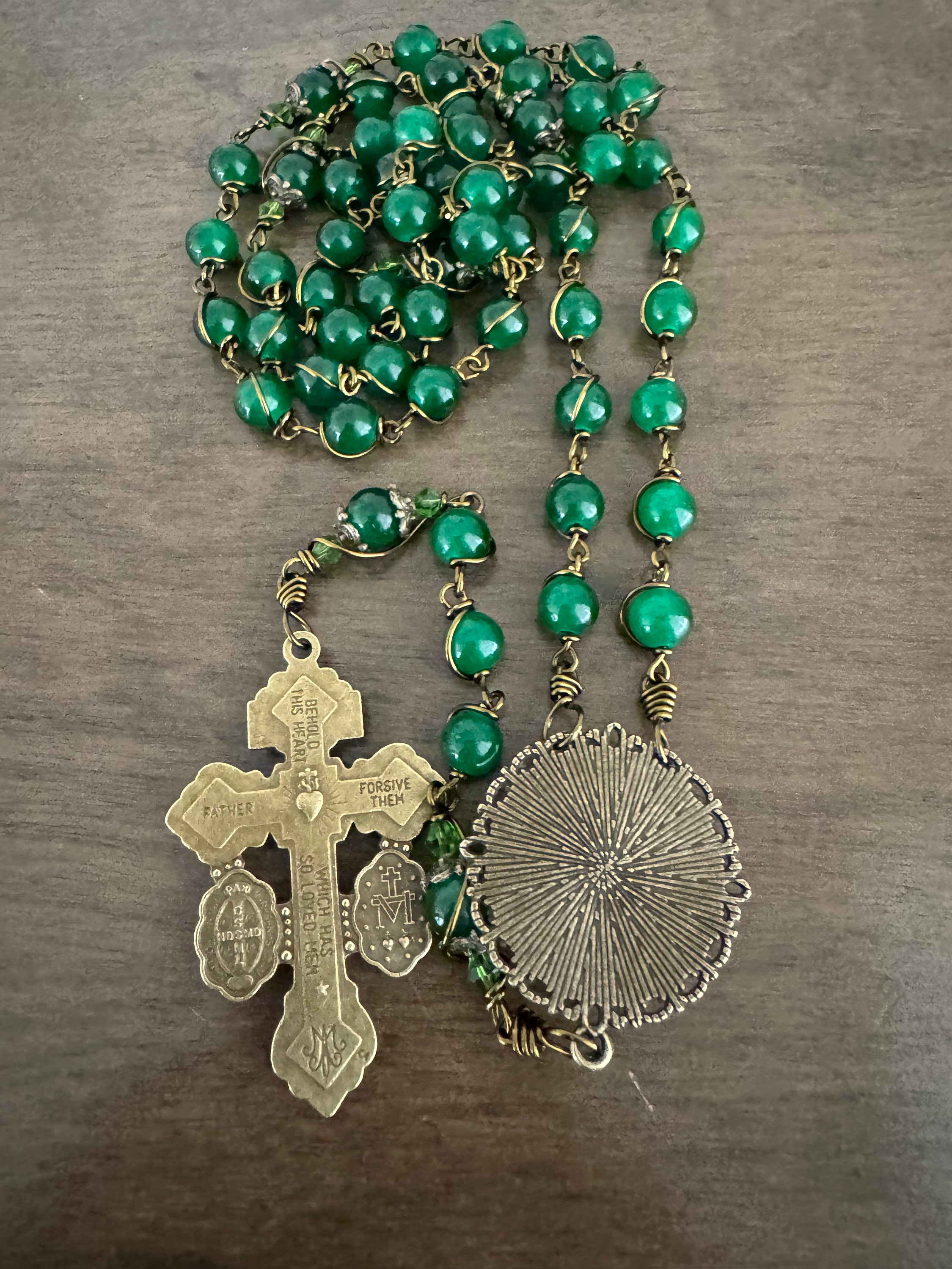 This beautiful handmade rosary is made with 8mm green glass beads, 4mm glass beads, 1 1/2 inche center medal, and 2 inches crucifix.