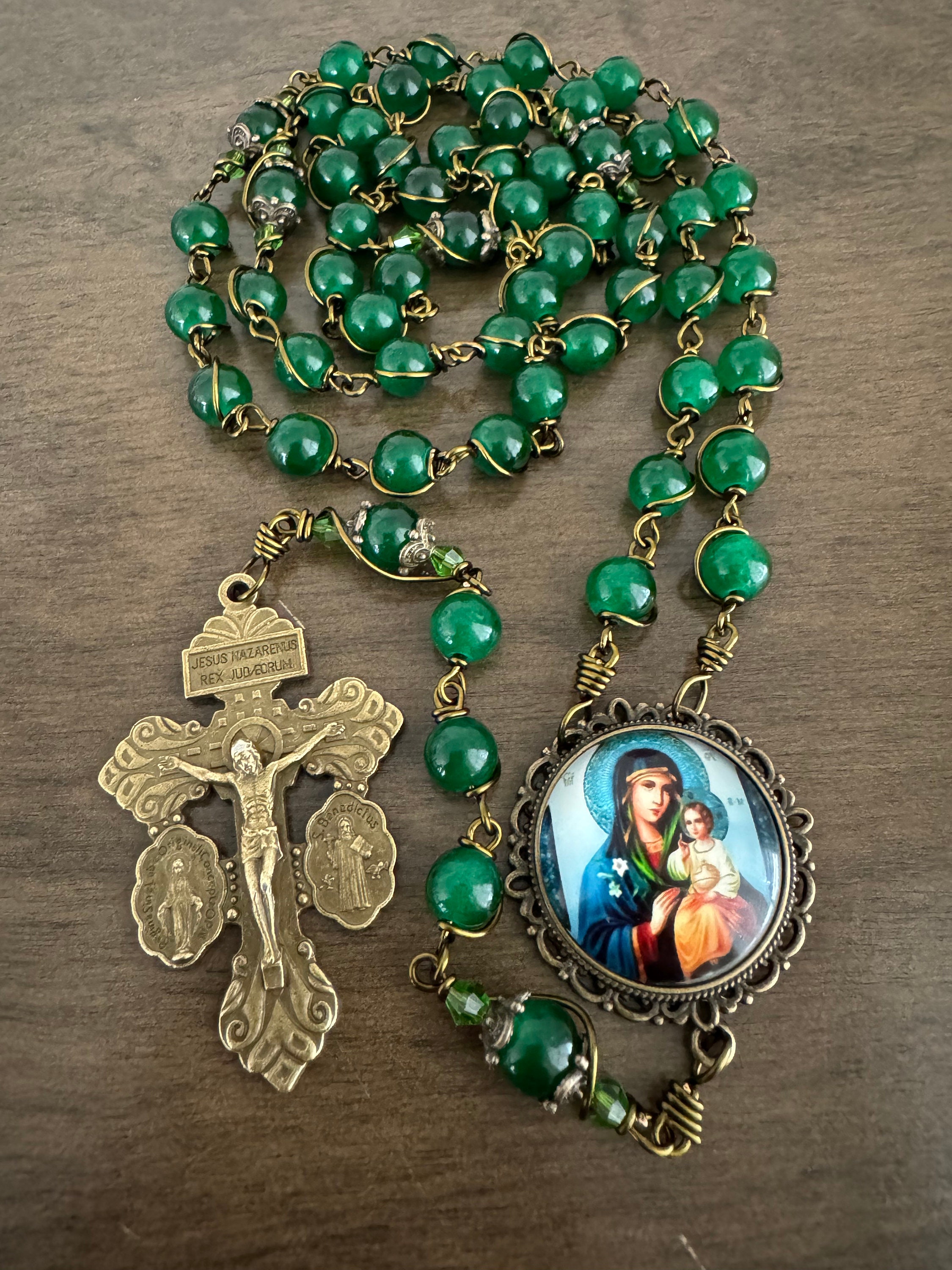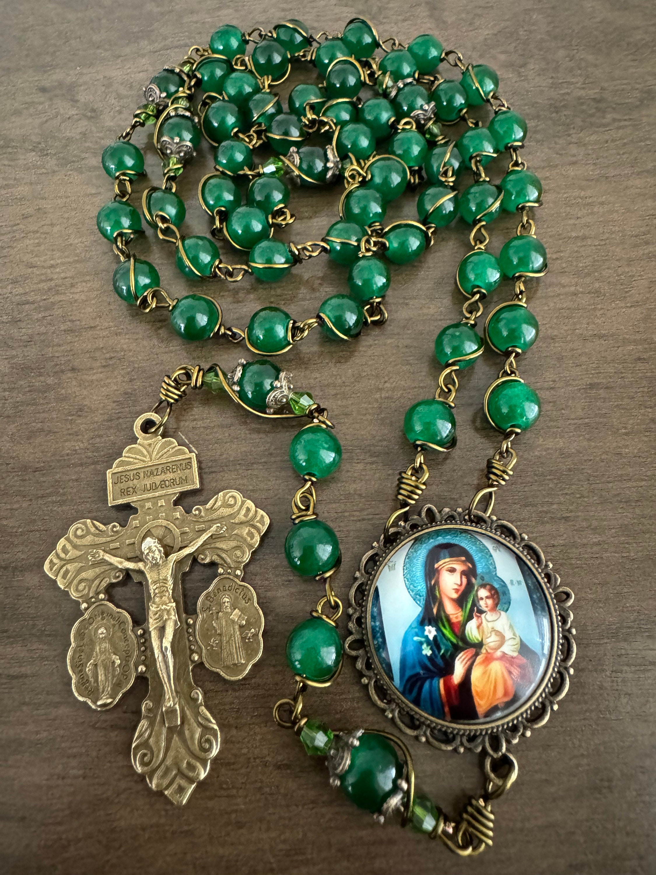 The Rosary is the most vibrant and beautiful green and Our Lady is with the infant Jesus.