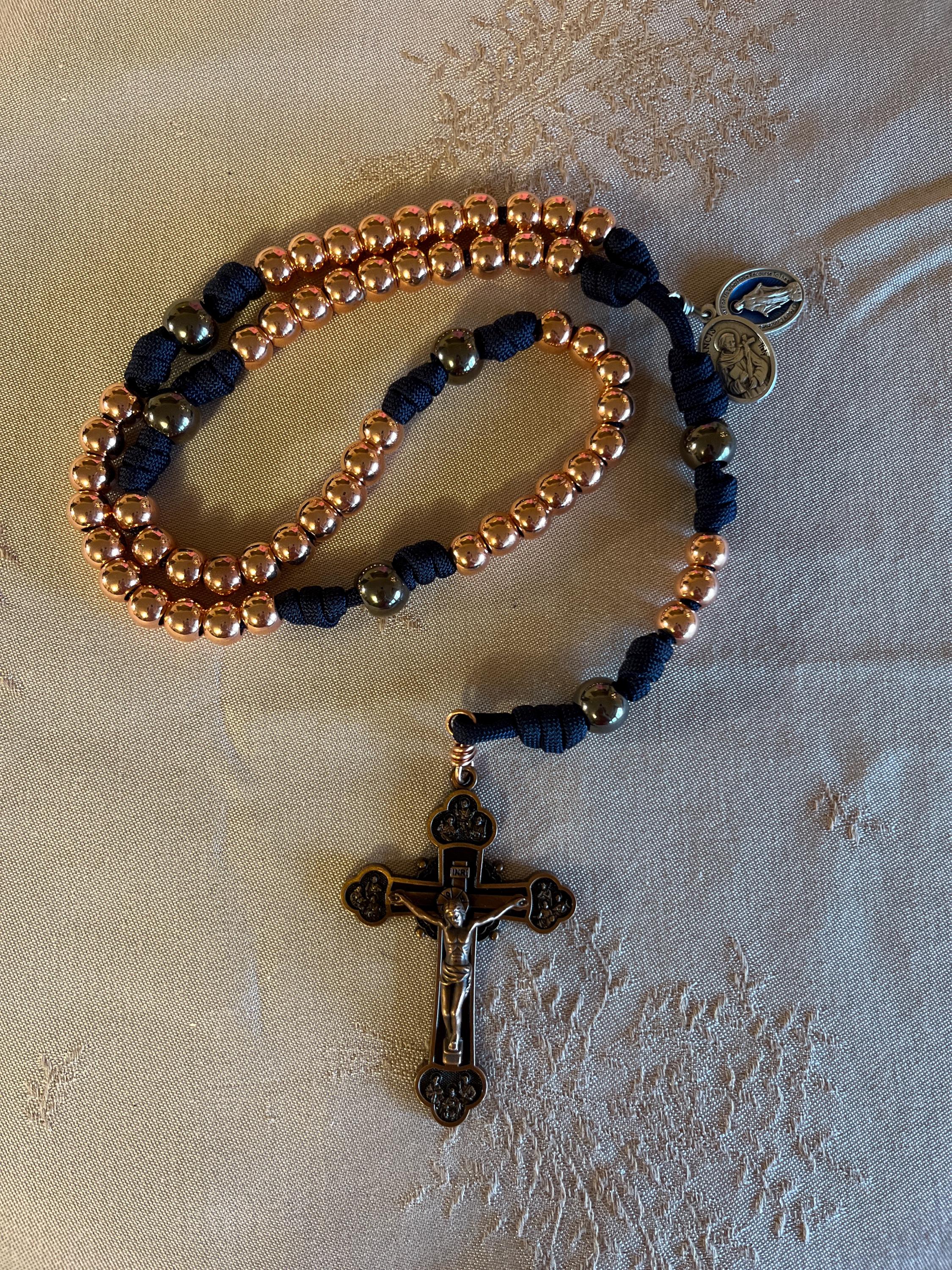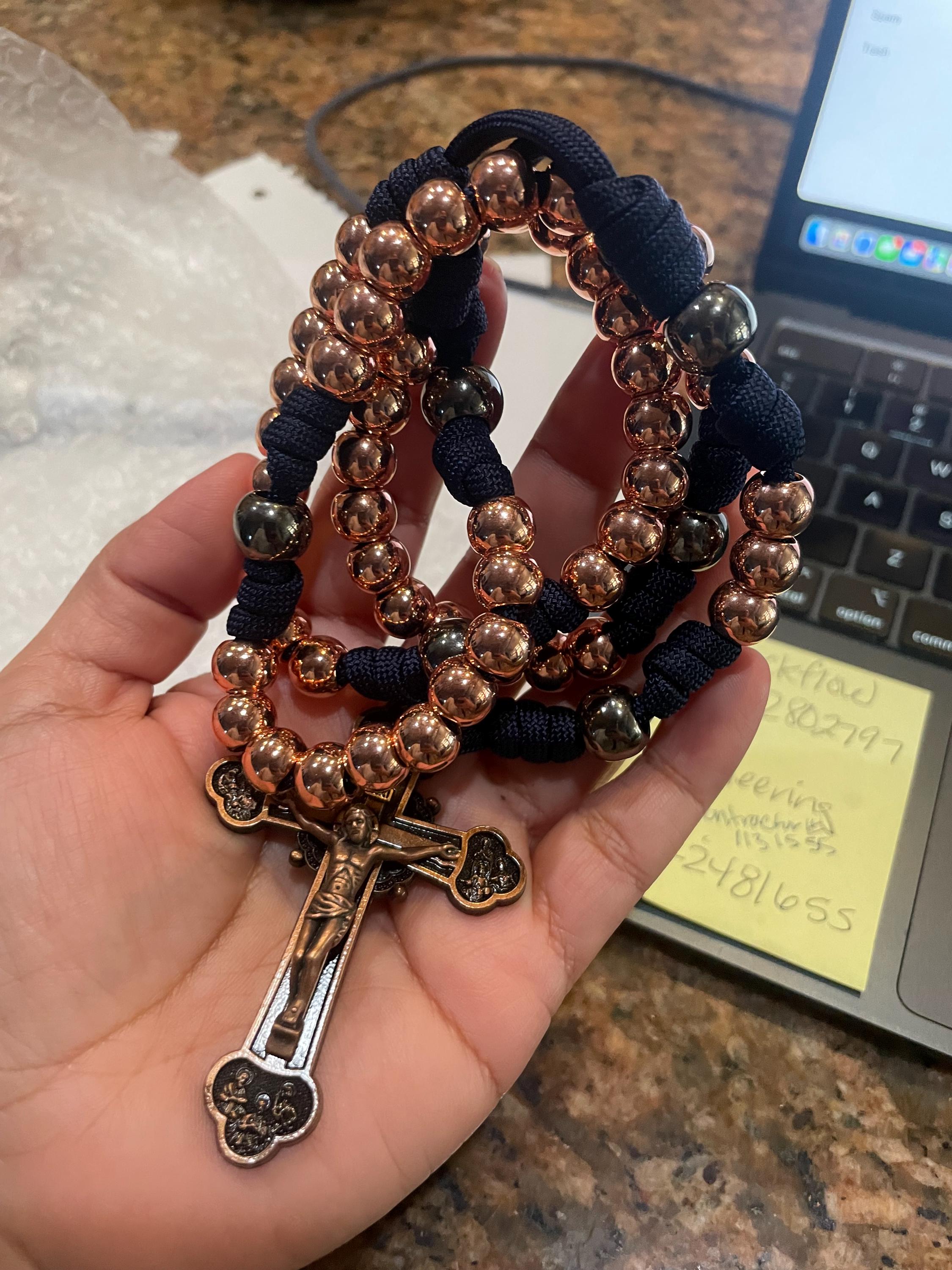 I purchased this rosary and received it today. It is exceptionally beautiful and well made. I find it the most treasured rosary I have purchased. I like it so much that I’m ordering a look- a- like one with copper stainless steal beads for days when my arthritis is so bad. I like a heavier rosary but this one is for when I’m in such pain that it makes a heavier rosary even more painful. Otherwise this rosary is exceptionally in every way , for my less painful days. I’d like to mention that the crucifix is highly detailed and the best I have now, taking first place for my favorite rosary of all. Seller left just enough space between beads to making praying easier. Knots are well made and did I mention “it’s Beautiful !