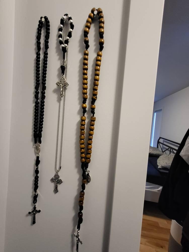 I am very impressed with this Rosary. I love the large wooden beads and the paracord looks to be knotted well. This will no doubt become one of my favorites in my Rosary collection. Just what I was looking for. Big enough to wear too!