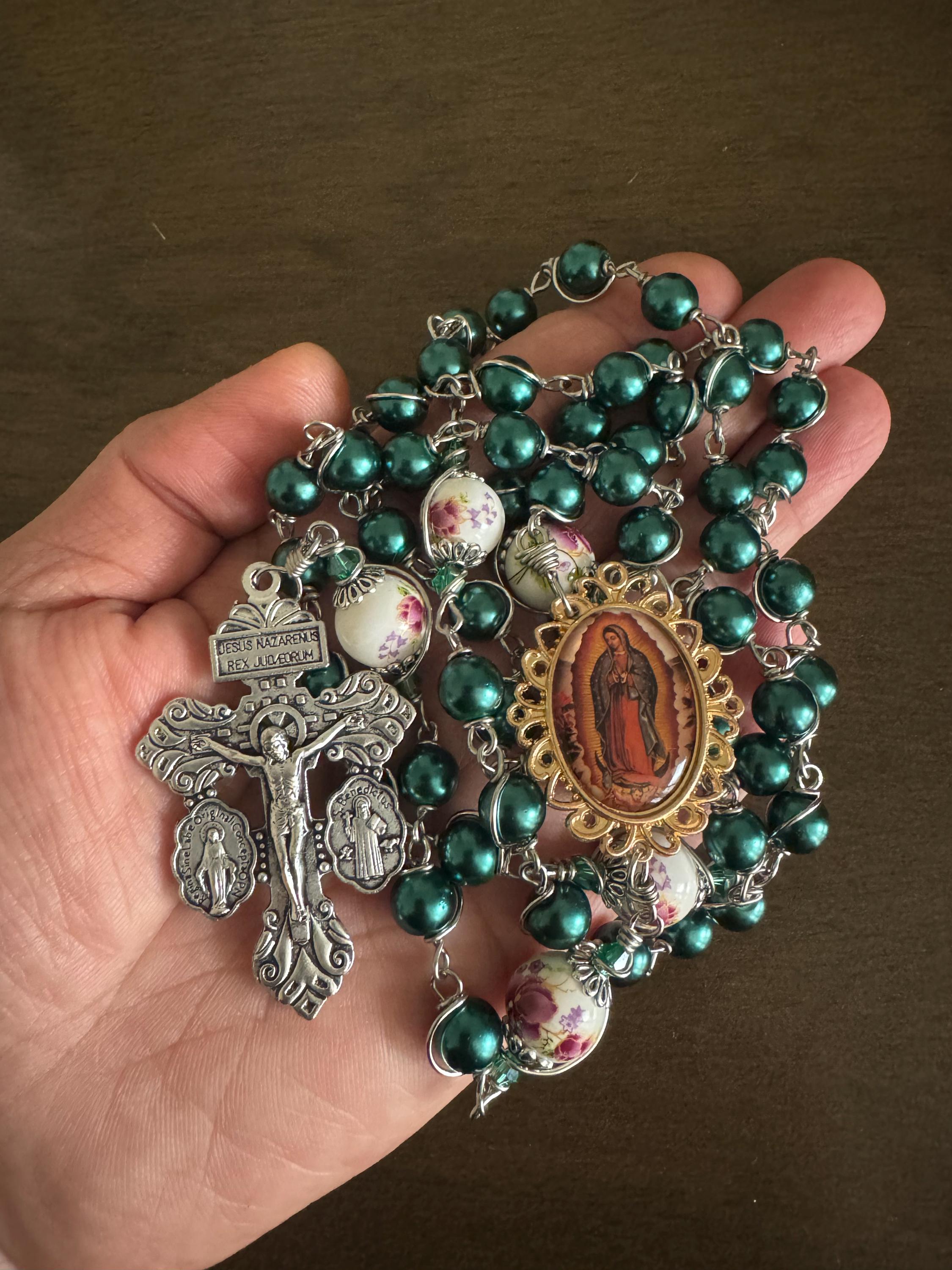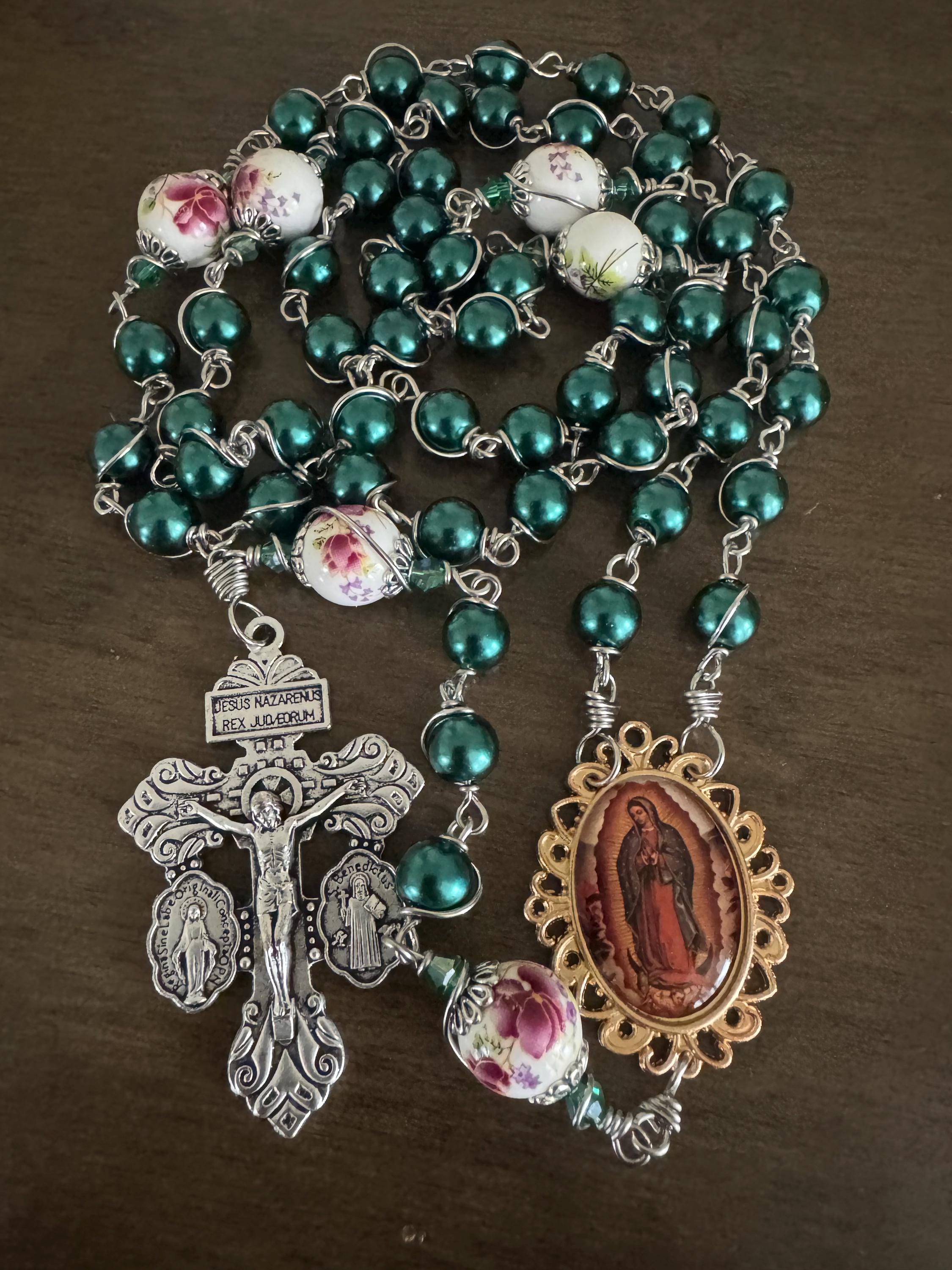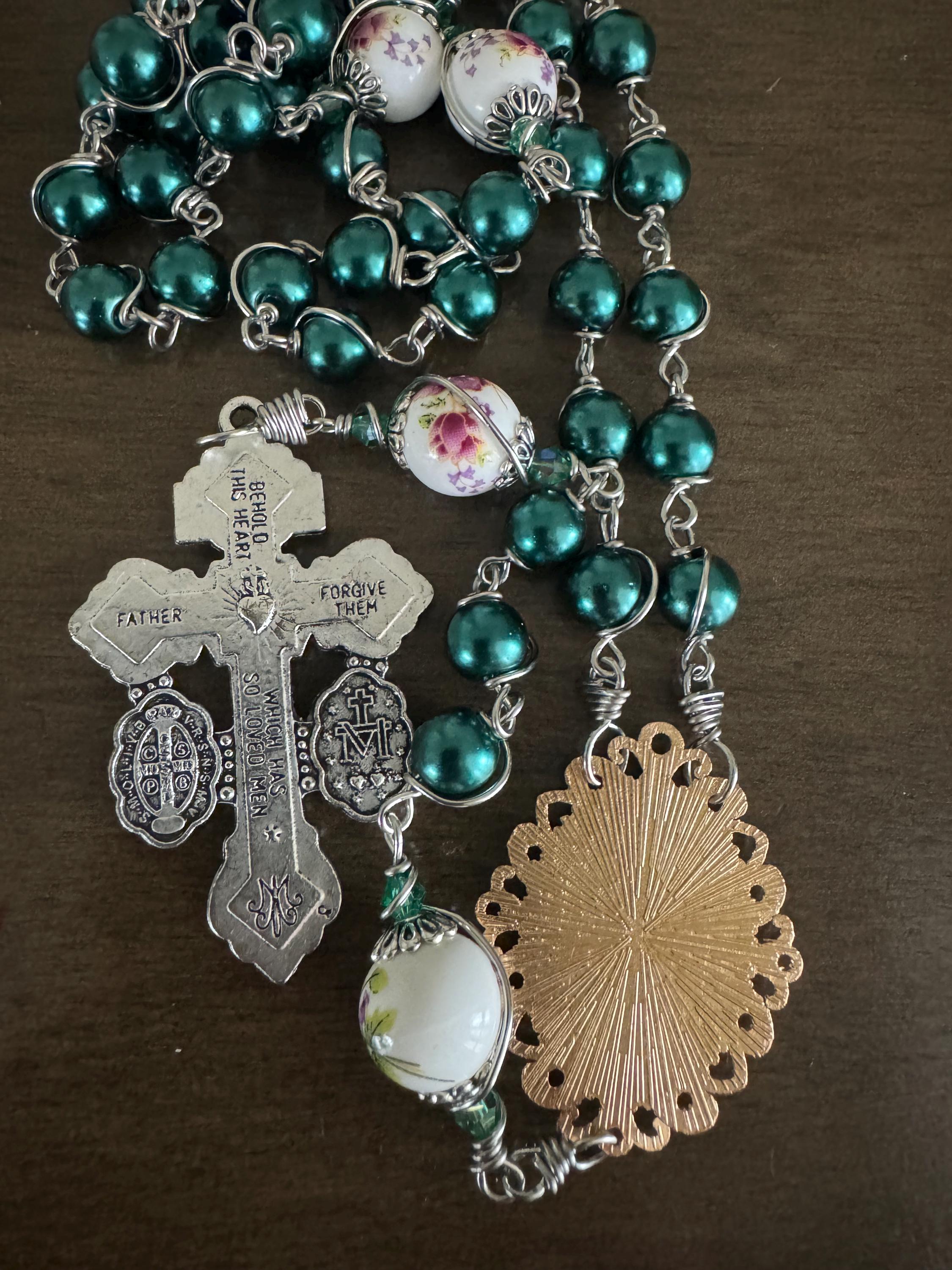 This beautiful handmade rosary is made with 8mm teal glass pearls, 10mm ceramic beads, 4mm crystals and 2” Pardon crucifix.