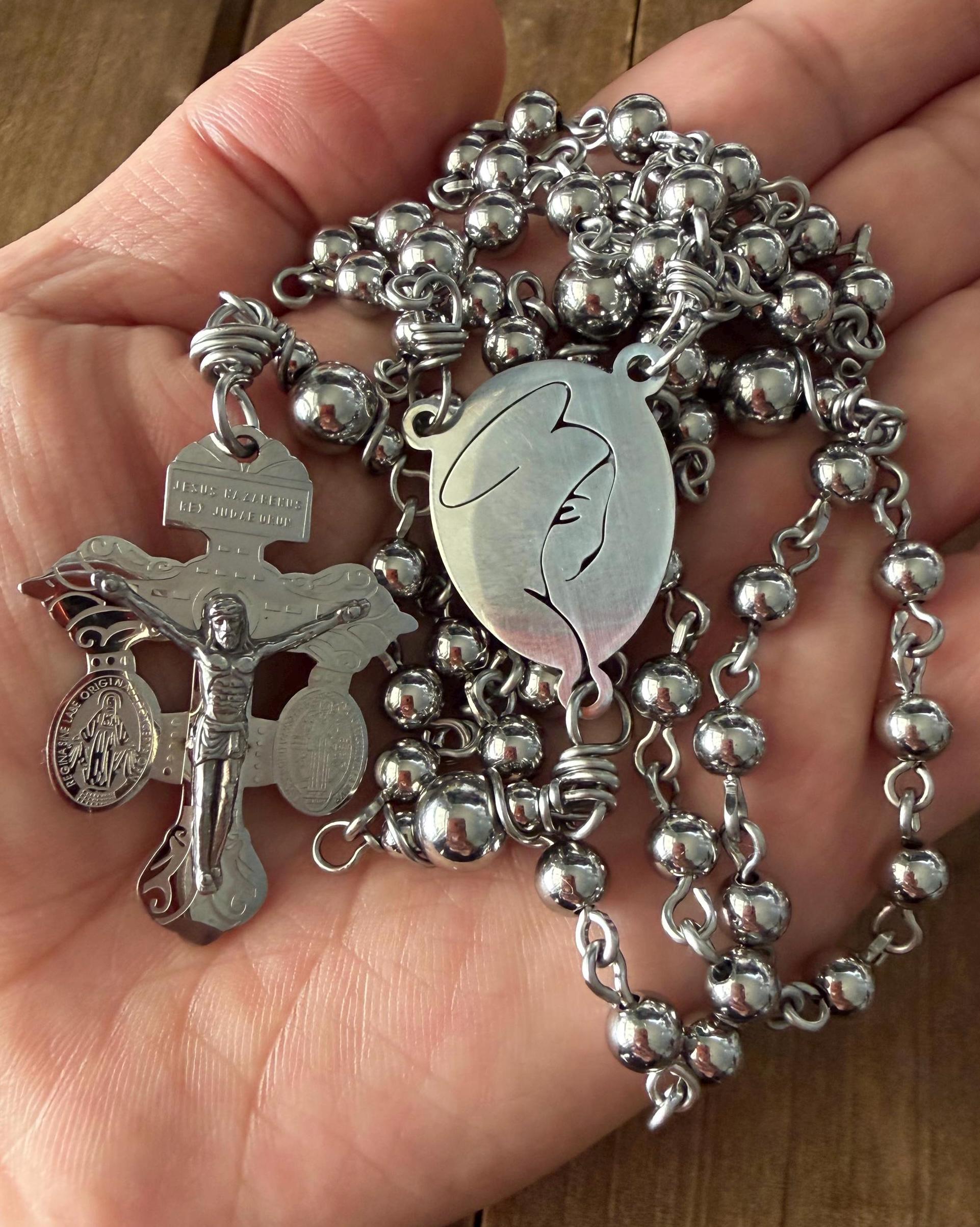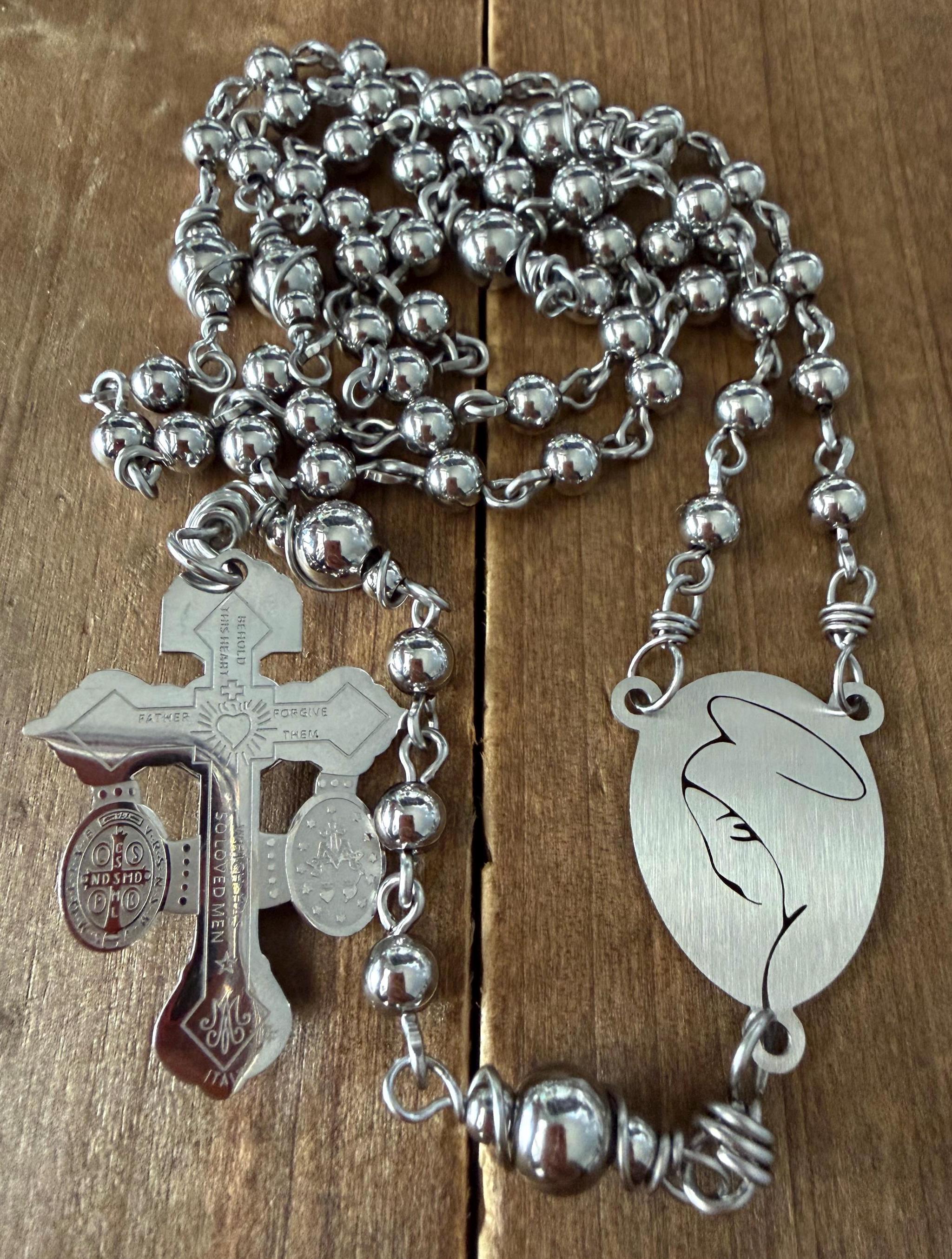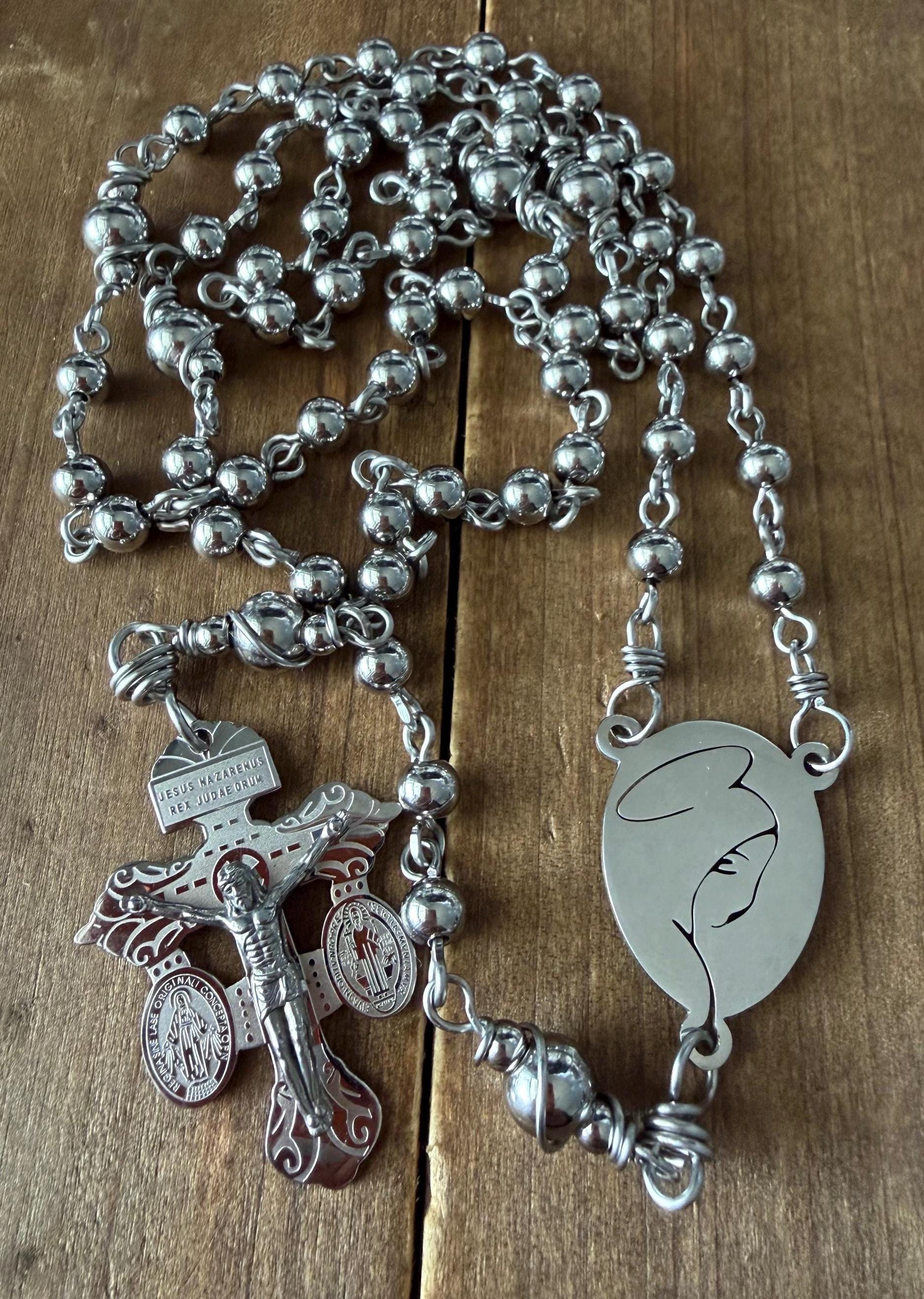 This beautiful handmade rosary is made with 6mm Stainless Steel beads, 8mm Our Father stainless steel beads, Stainless Steel wire, 1” Center medal, and 2” crucifix.