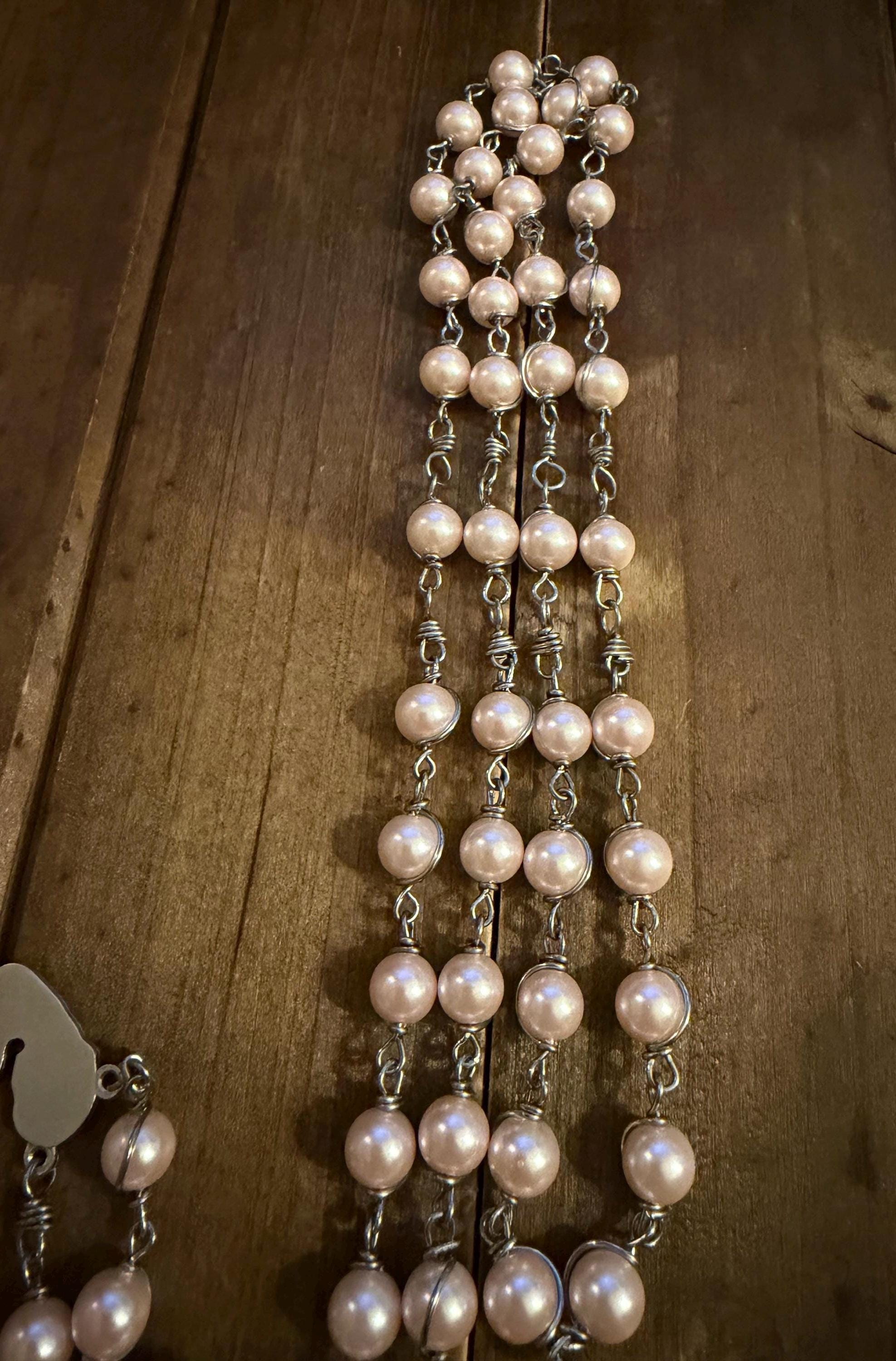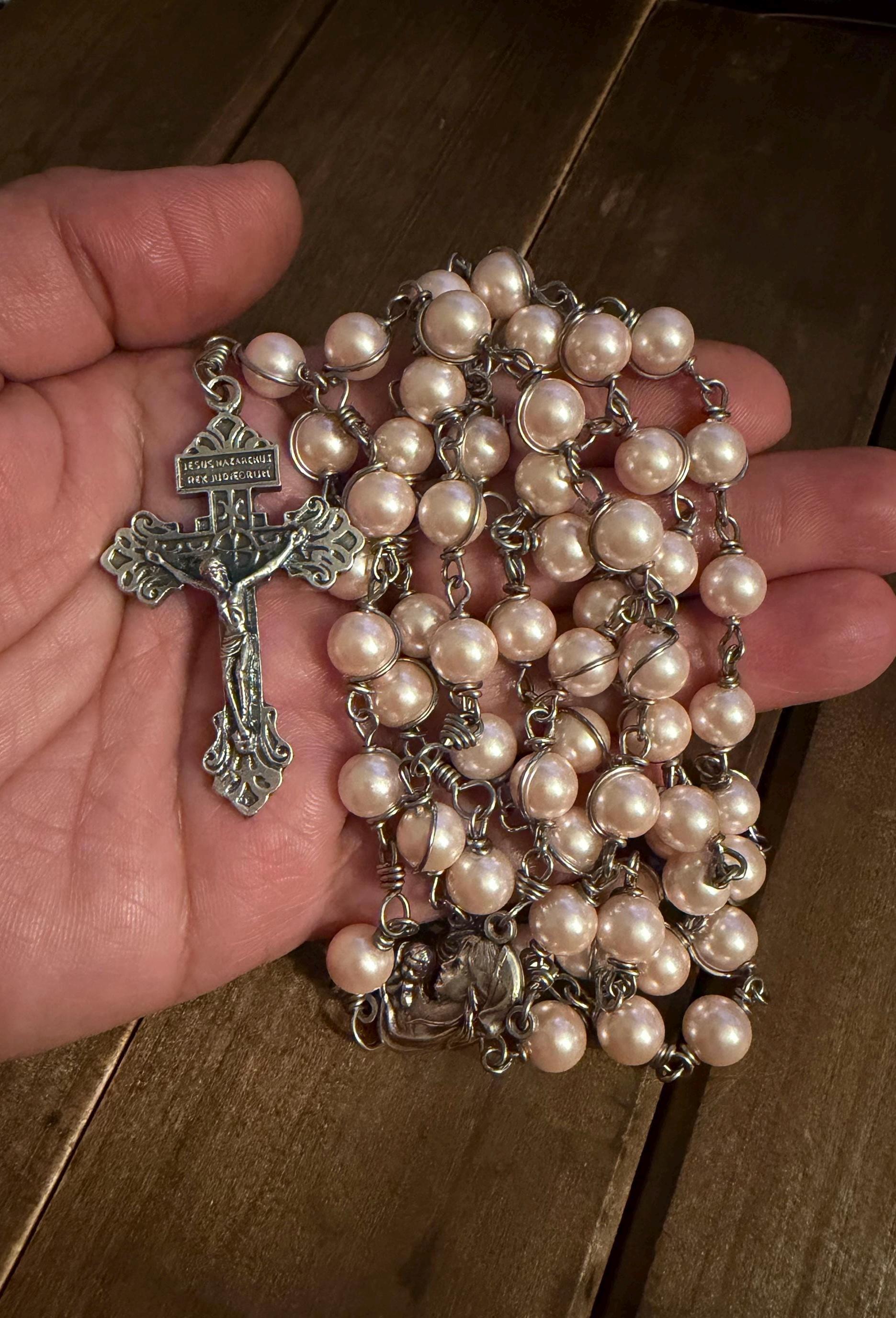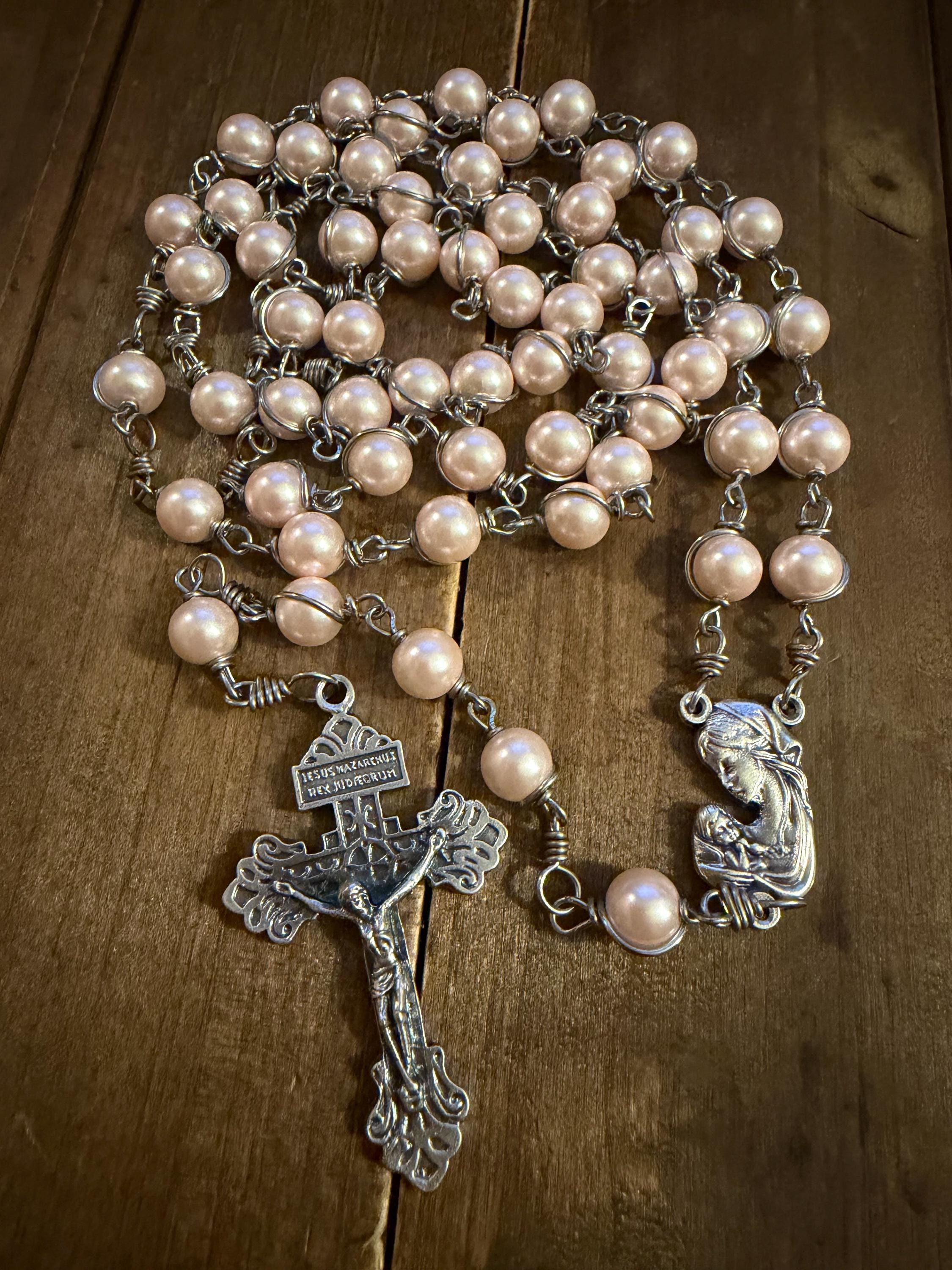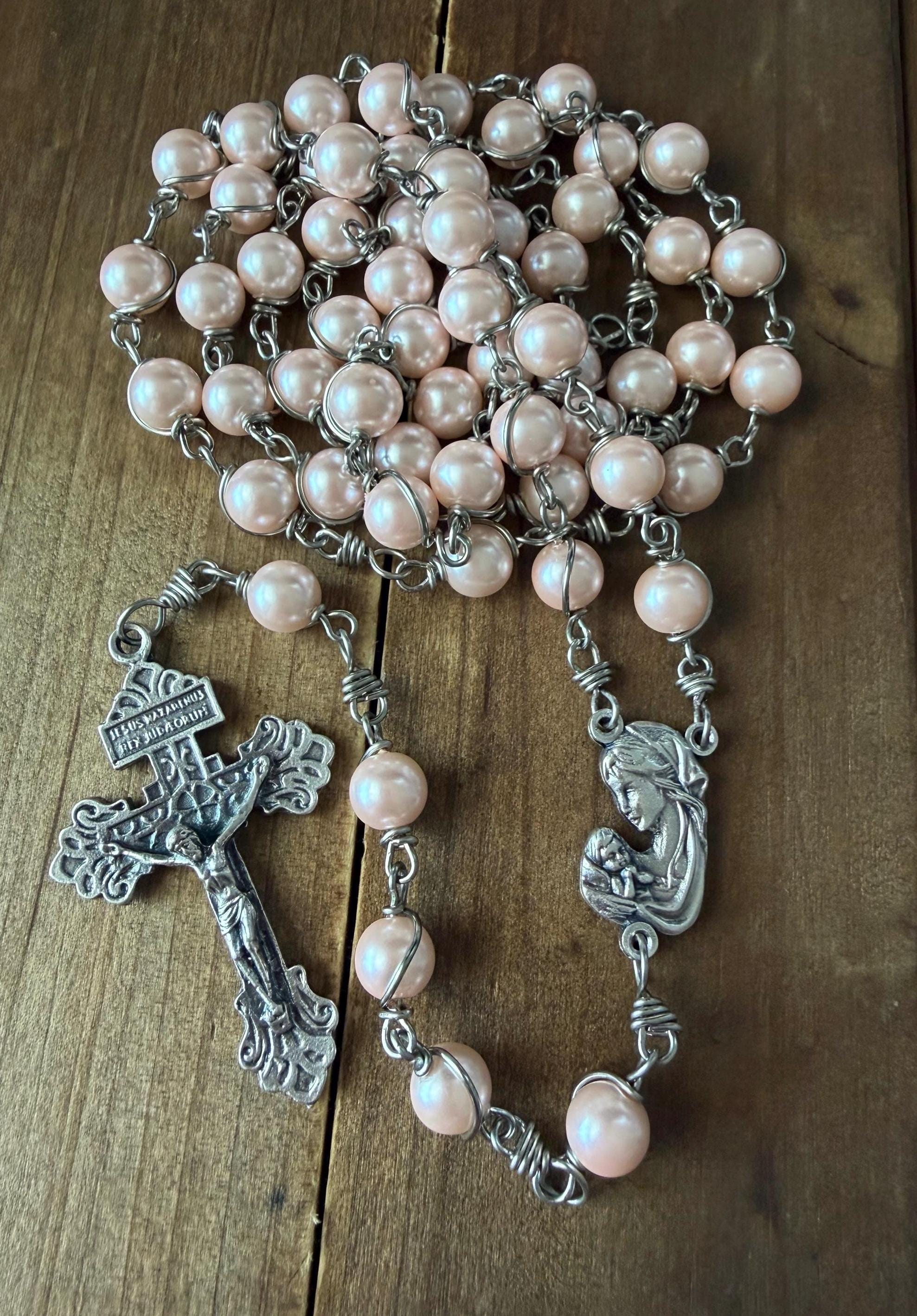 This beautiful handmade rosary is made with 8mm pink glass pearls and 2” Pardon crucifix.